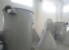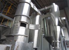 空氣經(jīng)過加熱器被加熱至~230℃左右,進入旋轉閃蒸干燥機。濕料由輸送裝置送入螺旋加料機構,螺旋加料器可無級調速。物料經(jīng)擠壓后強制進入主塔,隨即被高速旋轉而又具有不同角度的刀片粉碎,又被高速進入旋轉閃蒸干燥機主塔的高溫氣流沖擊高速旋轉、夾帶上升,這時氣流溫度急速下降,物料水分迅速蒸發(fā)從而完成干燥過程。被干燥的物料隨高速高溫氣流進入脈沖布袋除塵器。氣流由濾袋外部進入,向上排出,為防止濾袋積料,由脈沖電磁閥定時、輪流由各濾袋上部輸入高壓氣流(0.5~0.6Mpa),反復反沖濾袋,以達到*佳除塵效果。