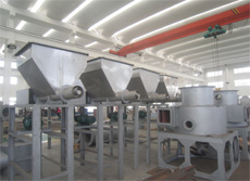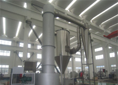 熱空氣由主機底部進風口切向進入閃蒸干燥機主塔、在閃蒸干燥機主塔內(nèi)形成螺旋形的上升高速旋轉氣流,同時根據(jù)不同的物料性質調整底部環(huán)隙大小,使風速處于合適的狀態(tài)。物料經(jīng)螺旋加料器直接進入閃蒸干燥塔,在高速氣流的沖擊和帶動下,迅速分散并隨氣流作高速旋轉運動。對于比較大且潮濕的顆粒團,高速氣流不足以使之破碎并高速旋轉,于是在重力作用下逐漸下落,當落到主機底部時被設置在底部的破碎裝置強行破碎并微?;缓箅S高速氣流一并旋轉上升而完成干燥過程。為了使物料的終水分達到極低同時不受初水分的波動而影響產(chǎn)品質量,在干燥塔內(nèi)設置多層旋流片,形成較為穩(wěn)定的流態(tài)化床,同時旋流片亦起到保證干燥所必須的停留時間和分級的作用。