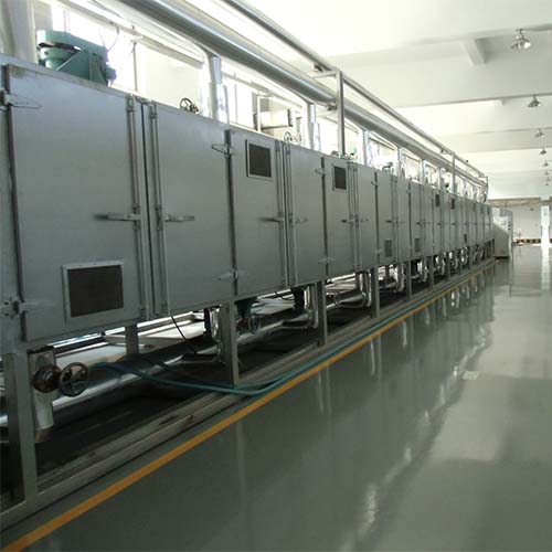 將所要處理的物料通過適當(dāng)?shù)募恿蠙C構(gòu)(如星型布料器、擺動帶、粉碎機或造粒機),分布在輸送帶上,輸送帶通過一個或幾個加熱單元組成的通道,每個加熱單元均配有空氣加熱和循環(huán)系統(tǒng),每一個通道有一個或幾個排濕系統(tǒng),在輸送帶通過時,熱空氣從上往下或從下往上通過輸送帶上的物料,從而使物料能均勻干燥。