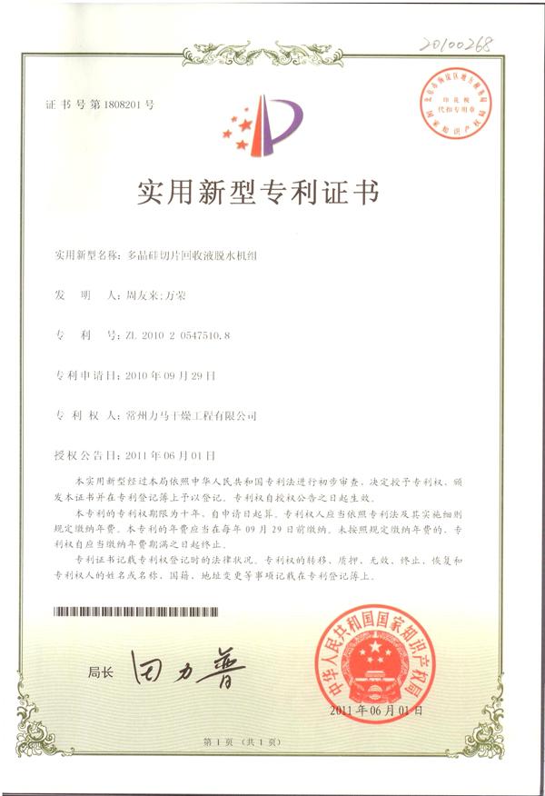 閉路循環(huán)式沸騰干燥機(jī)組專利證書