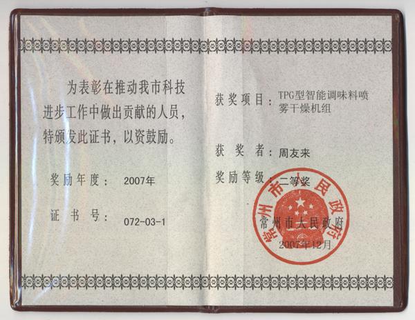 TPG型智能調(diào)味料噴霧干燥機(jī)組獲獎(jiǎng)證書(shū)
