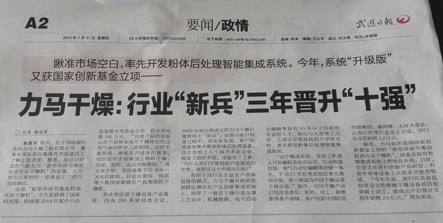經(jīng)常州市武進區(qū)科技局舉薦,在2013-2014年度科技創(chuàng)新工作中成績突出的常州力馬干燥工程有限公司,其企業(yè)創(chuàng)新精神,值得由地方官媒向全市全區(qū)進行報道,敦囑轄區(qū)各個高新技術企業(yè)持續(xù)走科技興企之路。