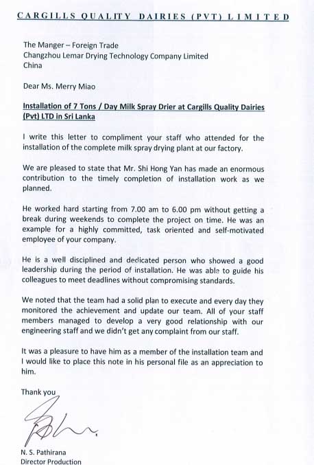 信中這樣寫(xiě)道:“親愛(ài)的Merry Miao女士:我寫(xiě)這封信主要是想要贊美一下你公司的這次參加了我們廠完整的牛奶噴霧干燥設(shè)備安裝的員工。我們真的很高興,特別是史洪雁先生,他在這次安裝任務(wù)中作出了巨大的貢獻(xiàn),他按照我們的計(jì)劃時(shí)間表提前完成了安裝工作。他工作很努力,每天從早晨7點(diǎn)到下午6點(diǎn),周末都沒(méi)有休息,只為了能夠按時(shí)保質(zhì)保量完成項(xiàng)目。他代表著一個(gè)致力于任務(wù)導(dǎo)向和自我激勵(lì)的公司。并且他是一個(gè)很有紀(jì)律的人,在領(lǐng)導(dǎo)小分隊(duì)安裝期間,嚴(yán)格要求自己,一直堅(jiān)持到最后完成安裝。我們還注意到,你們的團(tuán)隊(duì)計(jì)劃非常明確,每天都在監(jiān)控設(shè)備的使用情況,并對(duì)我們的人員進(jìn)行現(xiàn)場(chǎng)培訓(xùn)。你們所有的員工與我們的工程人員都相處得非常愉快,我們沒(méi)有得到任何來(lái)自我們員工的投訴。最后,我想說(shuō)的是,我把史洪雁先生寫(xiě)在信中,只是因?yàn)閱渭兊男蕾p這個(gè)人。”